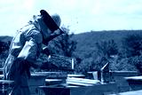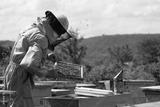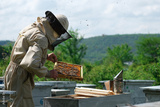 Beekeeper on apiary. Beekeeper is working with bees and beehives on the apiary.