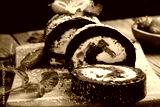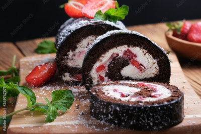 Recipe for biscuit rolls with strawberries decorated with fresh mint leaves.
