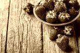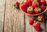 Freshly picked Strawberry in wooden bowl on wooden background. Healthy eating and nutrition.