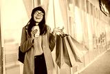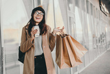 Beautiful fashionable woman drink coffee walking near mall with shopping bags.
