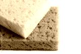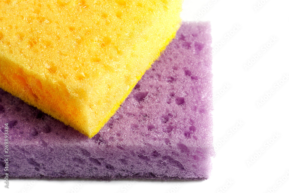 Colored sponges for washing dishes and other domestic needs. Yellow sponge lies on a violet sponge at a slight angle.