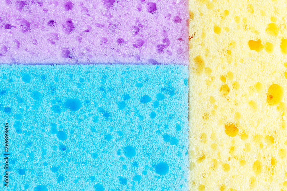 Colored sponges for washing dishes and other domestic needs. View from above. The texture of the purple, yellow and blue sponges are spread out in thirds, foam rubber.