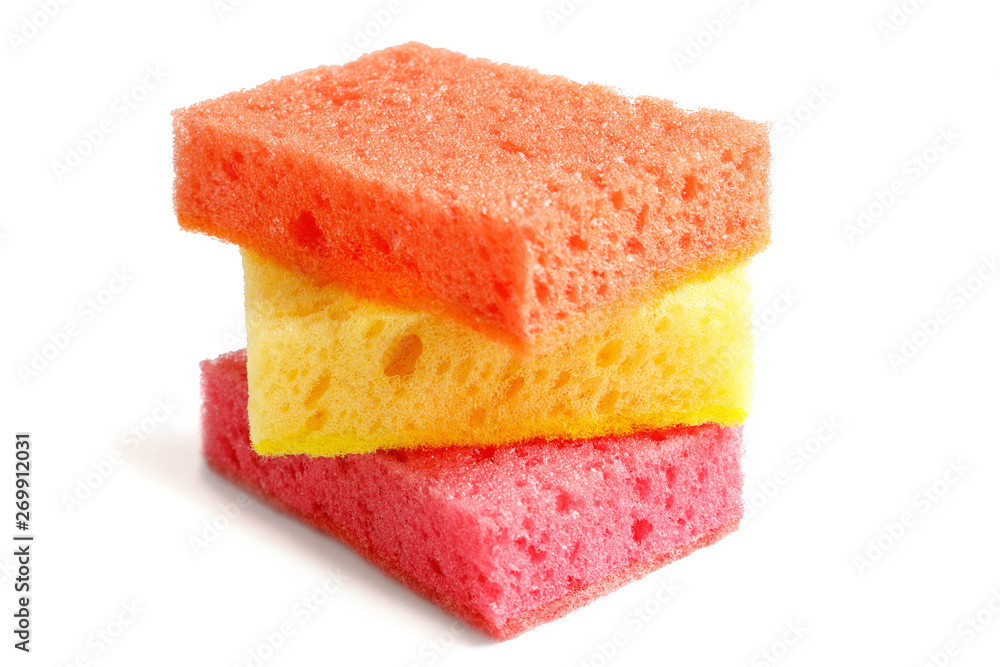 Colored sponges for washing dishes and other domestic needs. A yellow sponge lies between the orange and red lips at a slight angle. isolated