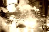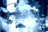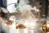 Some cars are crossing the 42nd street in Manhattan while steam coming out from from the manholes. New York City, Usa. 42nd Street is a major crosstown street in Manhattan.