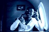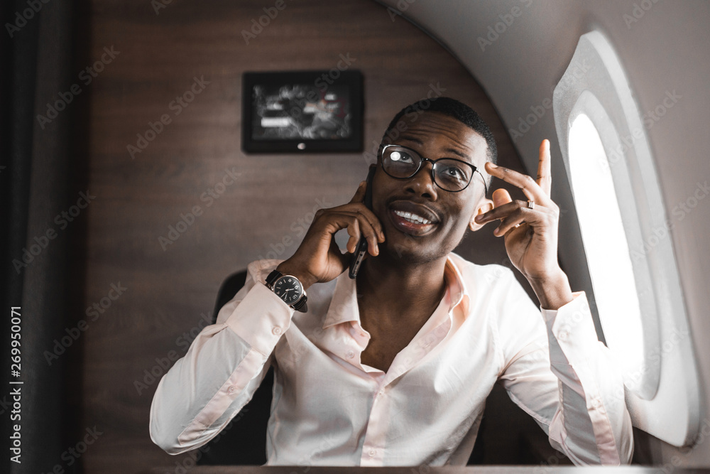 Young attractive and successful African American businessman with glassies talking on the phone and working while sitting in the chair of his private business plane
