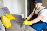 Cleaning service with professional equipment during work. professional kitchenette cleaning, sofa dry cleaning, window and floor washing. man and women in uniform, overalls and rubber gloves