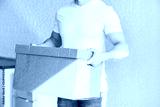 Delivery strong, muscular man loading cardboard boxes for moving to an apartment. professional worker of transportation, male loaders in overalls. free space for text, isolated