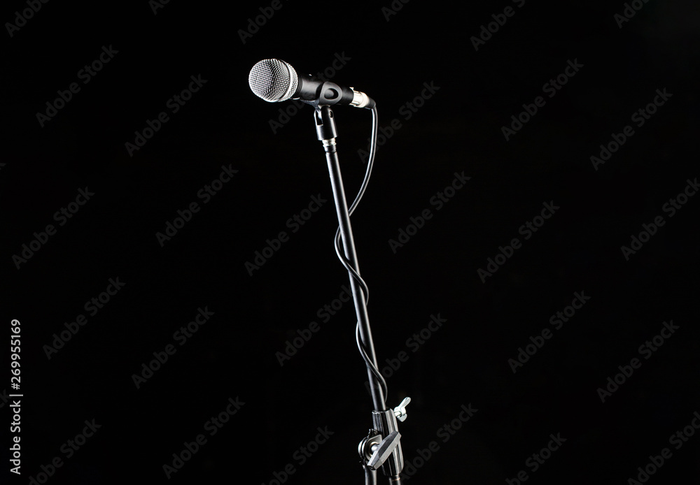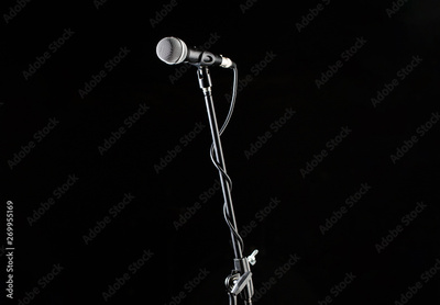 Microphone stand, microphone voice, closeup mic. Karaoke, concert, voice music. Vocal audio mic on a black background. Singer in karaokes, microphones. Live music, audio equipment, sing sound.