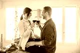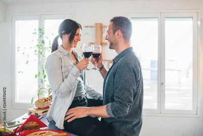 Engaged couple at a time of intimacy at home - Boyfriend and girlfriend toast with a glass of red wine - Wife and husband in their new home