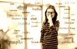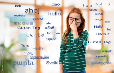education, translation and learning concept - smiling red haired student girl in glasses and green striped shirt over greeting words in different foreign languages on background
