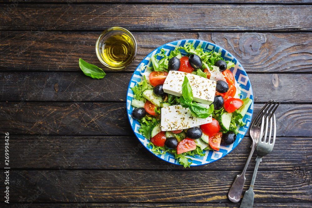 Fresh Greek salad of cucumber, tomato, sweet pepper, red onion, feta cheese and olives with olive oil. Healthy food, top view