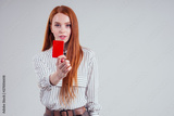attractive redhead caucasian businesswoman wearing striped shirt holding credit card stop red card removal violation referee sport judge studio white background black friday sale