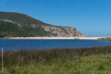 Beautiful landscape with sandy beach, blue water and mountain cliff
