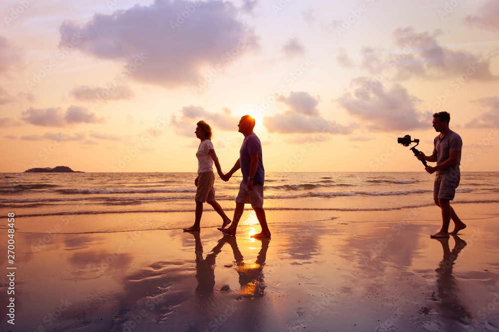 filmmaker filming video of couple with camera stabilizer on the beach at sunset, professional videographer working on film