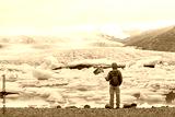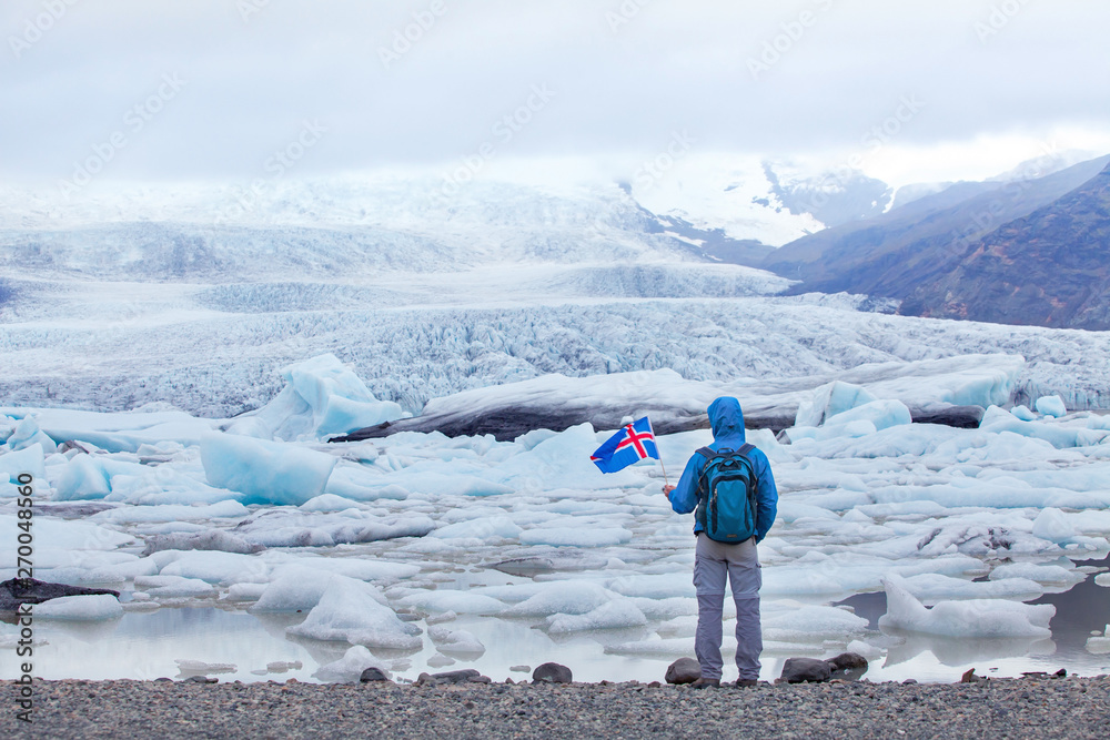 travel to Iceland, tourist in Jokulsarlon glacier lagoon holding icelandic flag, backpacker trip