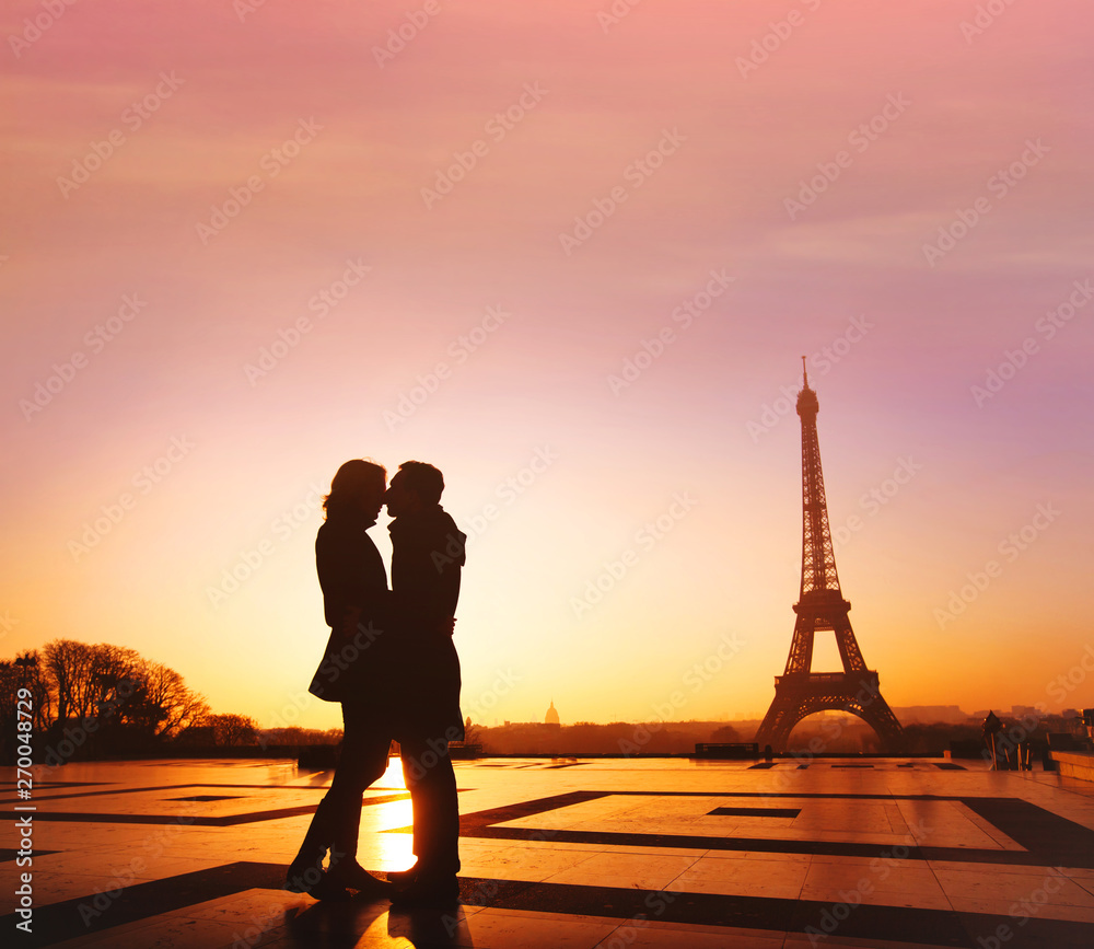 travel to Paris, honeymoon getaway to France, Europe, silhouette of romantic couple kissing near Eiffel tower
