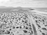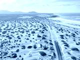 beautiful road in sand desert in Lanzarote coast, aerial landscape of car driving in Canary islands