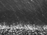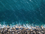ocean water surface texture view from above, background pattern of blue sea and cube stones on coastline