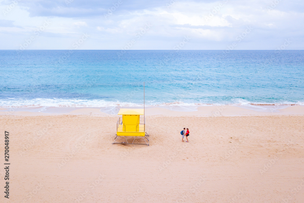 small couple in minimalist beach landscape near yellow hut and blue ocean, summer holiday travel to Canary islands