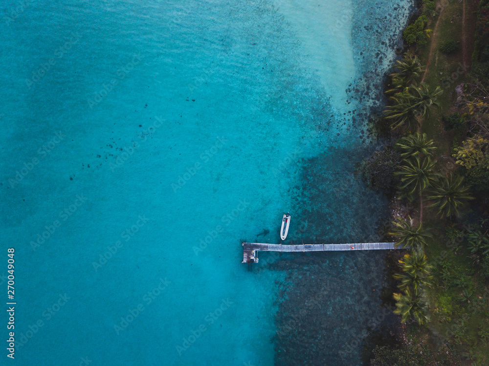 aerial landscape of tropical island and wooden pier with boat, top down view of blue water and palm trees from drone