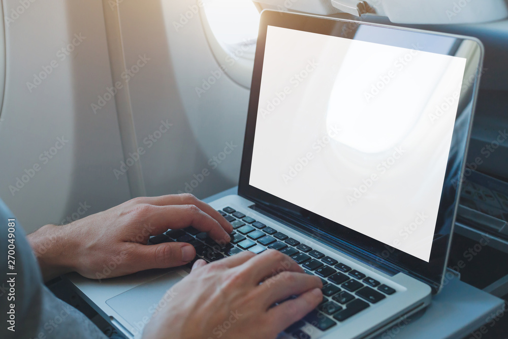 passenger using laptop computer in airplane, onboard wifi internet connection in flight, white empty screen