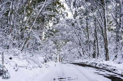 Winter forest landscape with ice and snow covered asphalt road