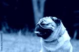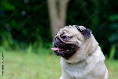 Happy dog pug breed smile with funny face on green grass in garden,Purebred pug dog healthy Concept