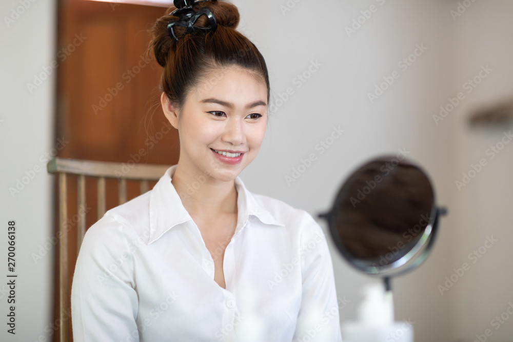 Portrait of a Beauty young woman brunette cosmetics looking in the mirror with fresh healthy facial skin,feeling so fresh and happiness,Beauty and Cosmetics Concept