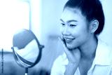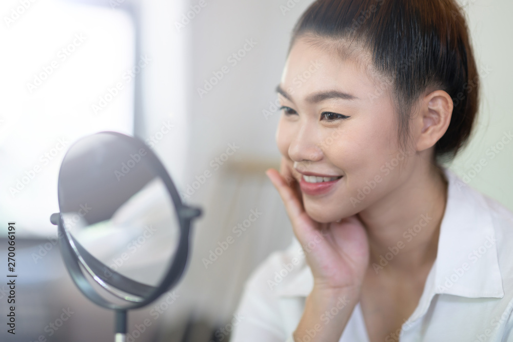 Portrait of a Beauty young woman brunette cosmetics looking in the mirror with fresh healthy facial skin,feeling so fresh and happiness,Beauty and Cosmetics Concept