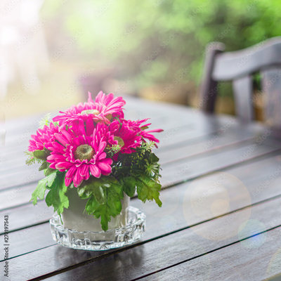 red, Burgundy flowers in a pot stand on a wooden table, street cafe green blurred background, close-up