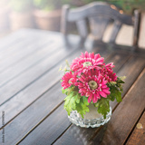 red, Burgundy flowers in a pot stand on a wooden table, street cafe green blurred background, close-up