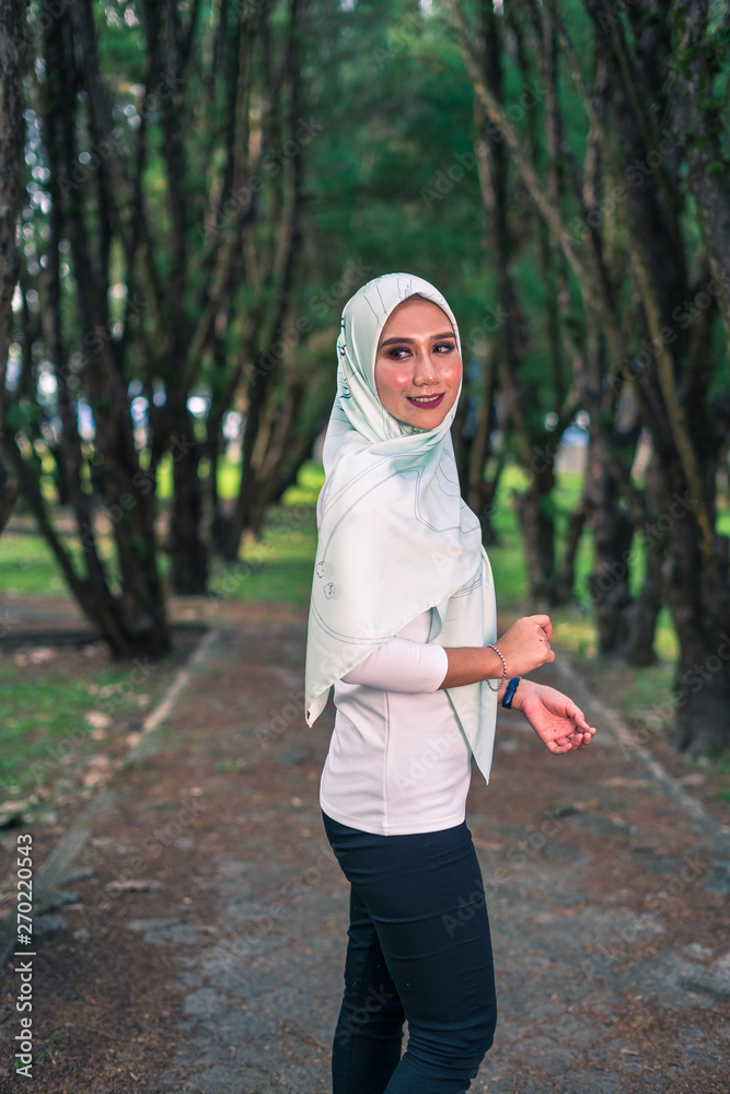 Young attractive Muslim Malay woman, modern contemporary fashion in hijab, close up portrait face and body, blurred background smiling and happy at park.