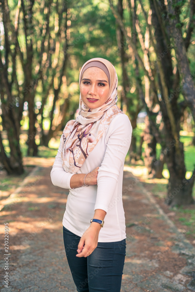 Young attractive Muslim Malay woman, modern contemporary fashion in hijab, close up portrait face and body, blurred background smiling and happy at park.