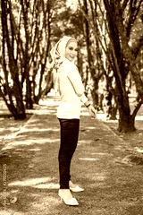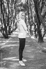 Young attractive Muslim Malay woman, modern contemporary fashion in hijab, close up portrait face and body, blurred background smiling and happy at park.