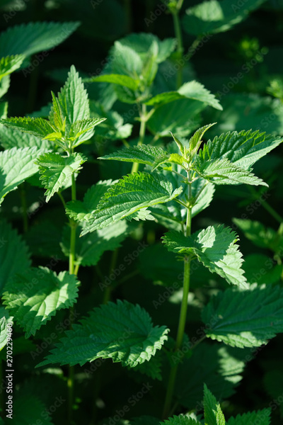 Stinging nettles or urtica medical herb close up, colorful and vivid plant, natural background.