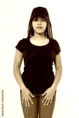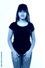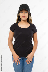 Template blank black t shirt and baseball hat. African american woman in summer clothes with copy space isolated on white background. Afro hairstyle. Mock up, place for print. Closeup girl front view