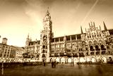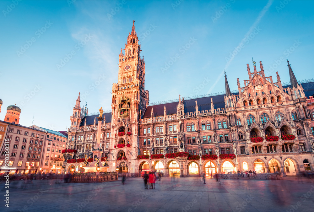 Fantastic evening view of Marienplatz - City-center square & transport hub with towering St. Peter's church, two town halls and a toy museum, Munich, Bavaria, Germany, Europe.