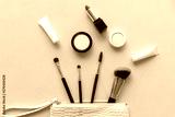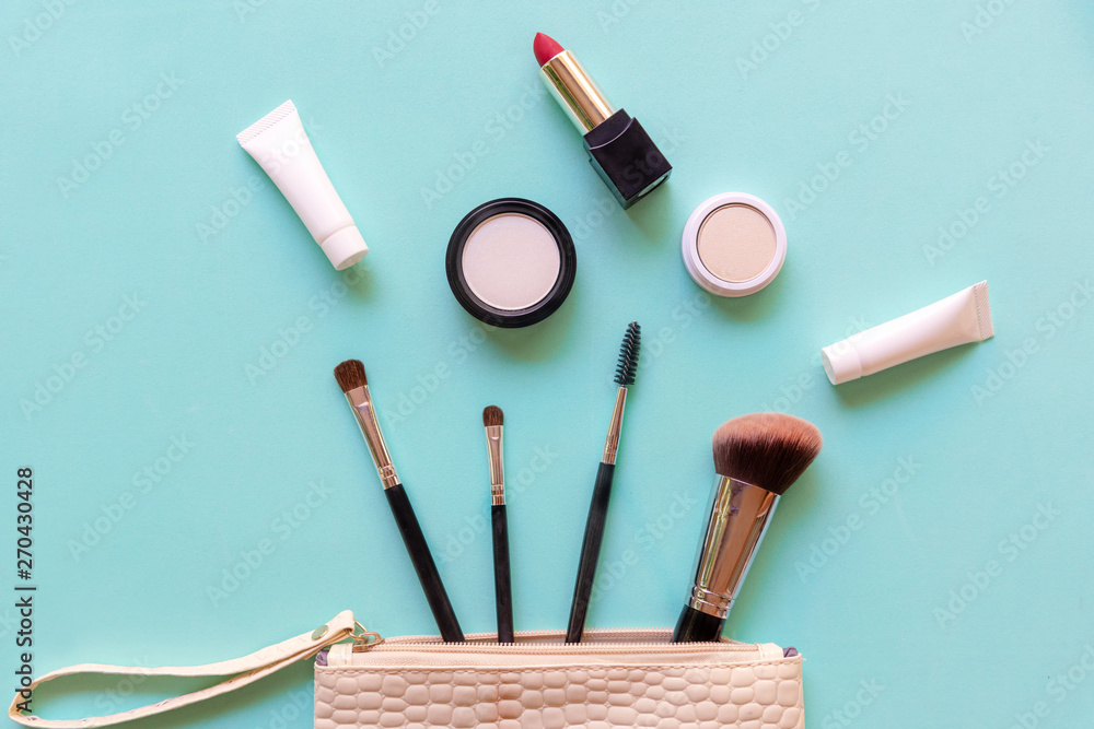 Makeup cosmetics tools and beauty cosmetics, products and facial cosmetics package lipstick, eyeshadow on green pastel background. Lifestyle Concept