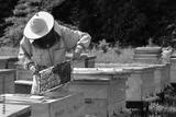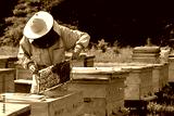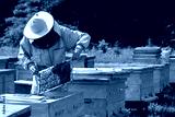 Beekeeper on apiary. Beekeeper is working with bees and beehives on the apiary.
