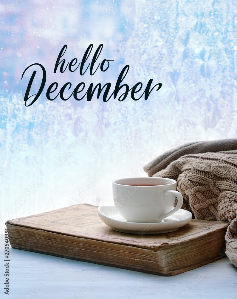 Hello December. Cup of tea, books and sweater on background of winter window. sweater weather, cozy home, winter season background. concept of home comfort in cold snowy weather.