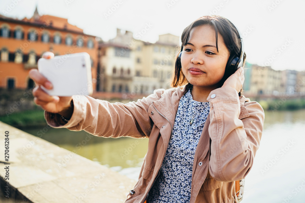 Young Filipino woman takes a selfie on an ancient bridge in Florence - Teenager listens to music near the Arno river - Spring in the city, tourist rests during a vacation at sunset