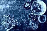 Healthy breakfast with granola, yogurt, fruits, berries on dark metal background. Summer homemade breakfast.