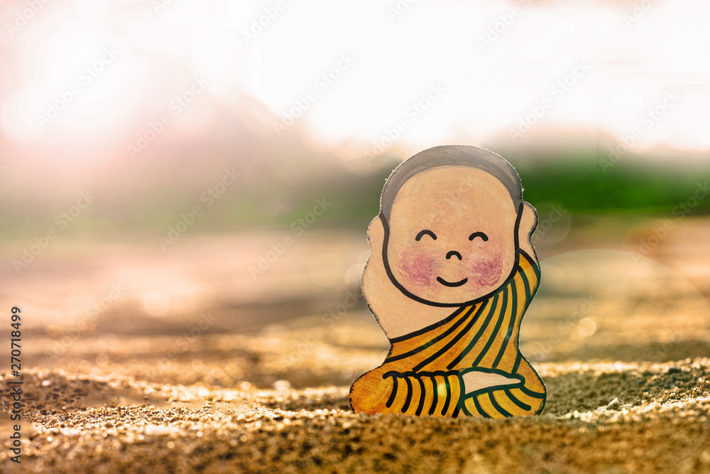 THE BOY - MONK (FIGURE) SITS ON THE SAND IN THE LOTUS POSITION. RAISED HIS HANDS UP, SMILING AND MEDITATING. Close-up, BLURRED BACKGROUND, copyspace
