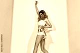 Excited fashionable DJ girl dance in colorful neon light. Creative music night club vibes. High Fashion. Sexy Woman with Dyed Hair in glamor outfit, stylish heels, dancing summer neon concept