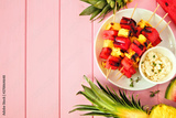Grilled watermelon and pineapple fruit kabobs. Top view side border on a pink wood background. Summer food concept.