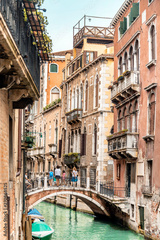 Old canal with boats and bridge in Venice, Italy. Street with old Italian architecture of Venice