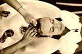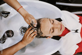 beauty and people concept - happy young woman with hairdresser washing head at hair salon