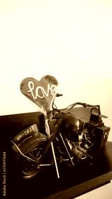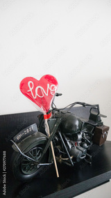 Metal motorcycle toy model on a wooden shelf with a lollipop in the shape of a heart