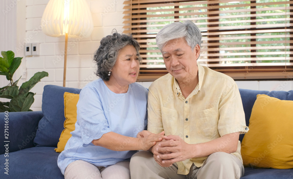 Senior asian woman comforting her husband from depressed emotion while sitting on sofa at home living room, old retirement lifestyle