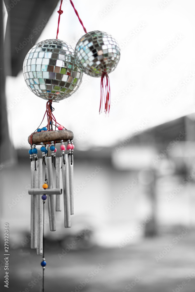 reflective balls and bells hang on the facade of the building on the street Khao Lak in Thailand. colored balls, black and white background. close up